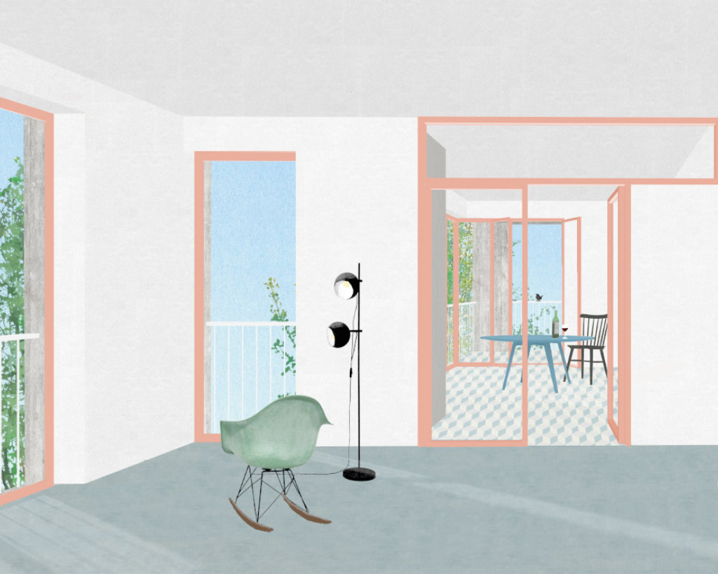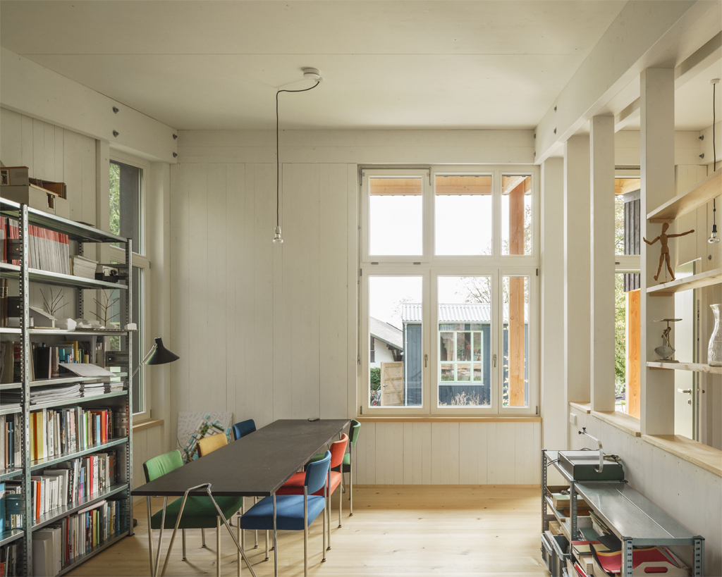 Ein Gebäudeensemble bestehend aus Hauptgebäude, Remise und Heizhaus bietet vielfältig nutzbare Räume für Wohnen und Werken an. Durch die Setzung der Gebäude, wird der Freiraum in einen zentralen Gartenhof sowie vier „Gartenzimmer“ mit unterschiedlichen Qualitäten gegliedert. Je nach Tages- und Jahreszeit wird der bewohnte, räumlich definierte Lebensraum somit erweitert. Viel Wert wird auf eine Verschränkung der Außen- und Innenräume gelegt, z.B. durch die nach Osten ausgerichtete, tiefe Veranda des Hauptgebäudes. Alle Innenräume des Hauptgebäudes erhalten somit im Erdgeschoß wie auch im Obergeschoß eine direkte Erweiterung im überdachten Außenraum. Die zusätzliche Nutzbarkeit der Veranda als außenliegende Erschließungsschicht ermöglicht bei Bedarf die freie Unterteilung des inneren Raumangebotes in mehrere Einheiten. Das Hauptgebäudes ist als Holzskelettbauweise konstruiert. Diese ist im Bereich der Außenwände zur Veranda hin mit Verglasung oder einer Ausfachung aus massiven Holzbohlen gefüllt. Die Ausfachung der Tragstruktur im Innenraum erfolgt je nach Notwendigkeit eines räumlichen Abschlusses mehr oder weniger offen. Im Inneren ergeben sich somit unterschiedliche Bezüge zwischen den einzelnen Raumsegmenten. Eine Anpassung je nach Lebensphase von einer gekammerten Raumfolge in einen großen strukturierten Raum ist mit sehr einfachen Massnahmen umsetzbar. Das Hauptgebäude ist eine robuste Raumstruktur, in die jederzeit weitere kleinere Gefäße wie Zimmer, Raumnischen, Schränke, Regale oder Küchenelemente hineingebaut oder hineingestellt werden können.