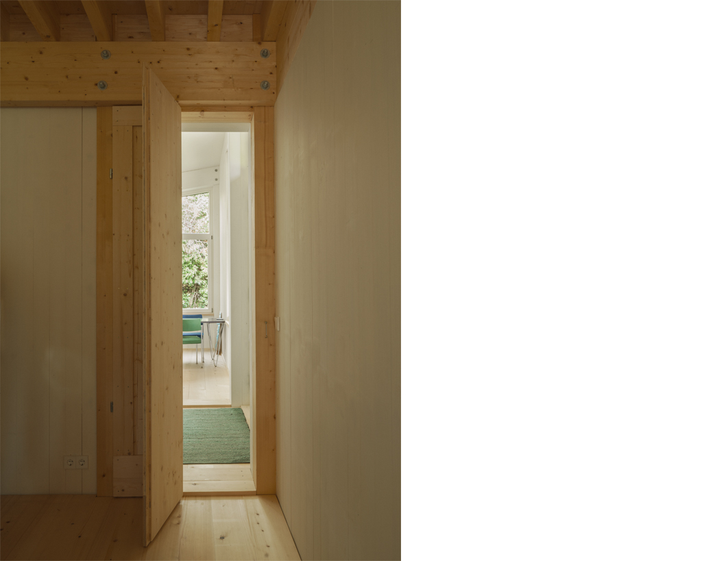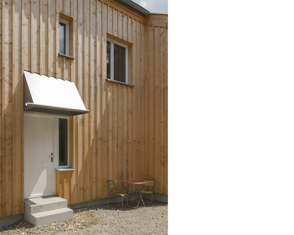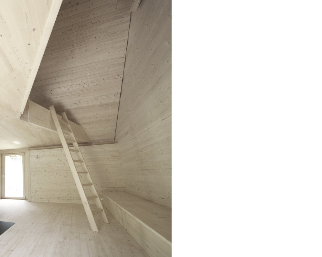 Der Neubau ist mit seinen 70qm Wohnfläche auf zwei Geschossen sehr kompakt. Gleichzeitig schafft sein räumliches Konzept ein sehr grosszügiges Raumgefühl, das an bestimmten Situationen gezielt mit dem Aussenraum Synergien aufbaut und seinen Fokus auf Innenräume legt, die sowohl alleine, als auch als Teil einer zusammenhängenden Raumabfolge genutzt werden können. Im Obergeschoss entsteht eine starke Kontrastwirkung durch die Gegenüberstellung von einem Kleinstraum und dem grössten Zimmer, vom Raumschnitt her gesehen einem Haus im Haus. Je nach Nutzungsbedarf kann die dazwischengeschaltete Wohndiele verkleinert und ein weiteres, zusätzliches Zimmer abgetrennt werden, so dass eine vierköpfige Familie das Haus bewohnen kann.