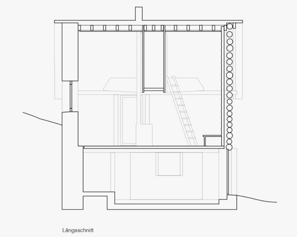 Eine Cascina (Stallscheune) wurde zu einem neuen, einfachen Lebensraum und individuellen Rückzugsort in den Alpen umgebaut. Die bauliche Substanz aus massiven Natursteinmauern im Sockelgeschoss und der aufliegende Holzstrickbau wurden umfassend baulich und konstruktiv ertüchtigt. Der Dachstuhl wurde nach historischem Vorbild neu aufgebaut, konstruiert als Capriata, aber als Neuinterpretation dieser historischen Konstruktion. Im Rahmen der kantonalen Gestaltungsvorgaben wurden nur die bestehenden Gebäudeöffnungen als Zugänge und Fenster umgebaut. Im ungeheizten Sockelgeschoss befinden sich die Nass- und Lagerräume. Innerhalb des bestehenden Strickbaus wurde eine neue innere Gebäudehülle aus fein profilierten, massiven Holzbalken eingebaut. Darin bildet ein zentraler Holzofen als Herd und Heizung das Zentrum des Wohnraumes. Im Dachstuhl bilden die quer gespannten Zuggurte der Capriata, ausgeführt in Brettsperrholz in Form einer Farfalla, die neue Schlafebene direkt über dem Holzofen. Das Gebäude konnte durch seine räumliche Logik und im Einklang mit dem alpinen Ort mit einer minimalen technischen Ausstattung konzipiert werden.
