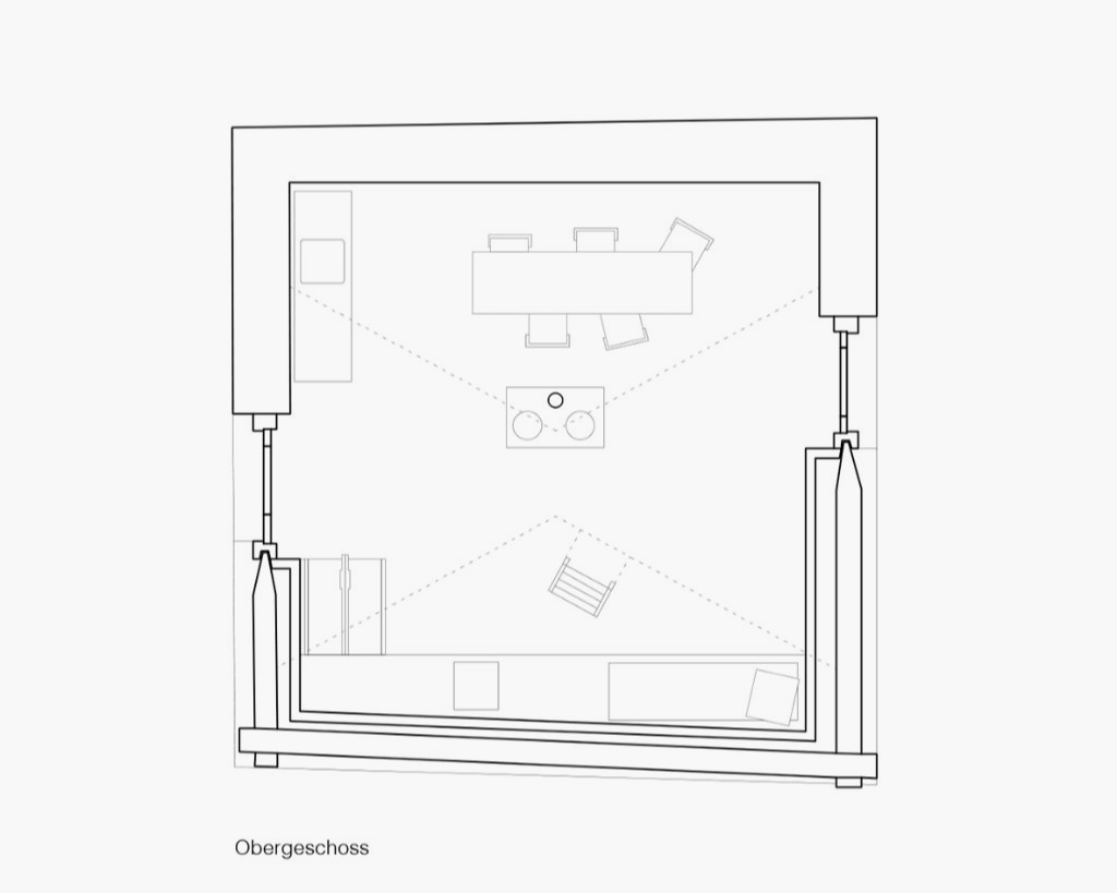 Als zentrale räumliche Idee bildet der Bestand mit dem neuen Wohnhaus einen gemeinsamen Erschliessungshof, der zum gemeinschaftlichen Zentrum der beiden Wohneinheiten wird. Beide Wohnhäuser verfügen im Erdgeschoss zudem über seitlich angeordnete Fenstertüren, die auf der Hof abgewandten Seite den privaten Gartenbereich des jeweiligen Hauses erschliessen. Beim Neubau ist durch das Gegenüber der alten Remise, unter deren schützendem Vordach sich der Gartensitzplatz befindet, auch der private Garten räumlich gefasst, von dem aus der Blick zurückfällt auf die drei Stufen hoch zur Küche.