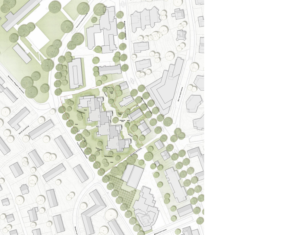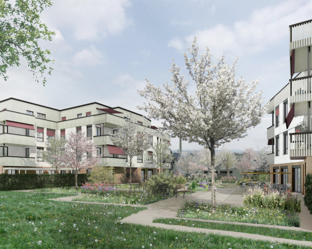 Die Wohn- und Siedlungsgenossenschaft Zürich (wsgz) beabsichtigt Ihr Areal in Mettmenstetten (ZH) in unmittelbarer Nähe zum Bahnhof mit altersgerechten Wohnungen, geeigneten Gemeinschaftsbereichen sowie zwei Pflegewohngruppen mit entsprechendem Aussenraum zu überbauen. Wir schlagen vor, die 50 altersgerechten Wohnungen und die Pflegegruppen in zwei Gebäuden zu organisieren. Die Volumen werden dabei möglichst weit an die östliche und westliche Parzellengrenze gesetzt. Die daraus entstehende Distanz der Baukörper ermöglicht eine grösstmögliche Privatheit der Wohnungen. Gleichzeitig schaffen wir damit einen großzügigen zentralen Garten, der als gemeinschaftlicher Erschliessungsraum, Aufenthaltsraum und sozialer Treffpunkt für die Siedlung dient und auch als Angebot an das Dorf verstanden wird. Durch seine Dimension und die vielfältige Bepflanzung garantiert er ein abwechslungsreiches, sinnliches Erlebnis für die Bewohner. Als Kontrast dazu werden die Gebäude jeweils dreiseitig von geschützten Gartenräumen eingefasst, was den Erdgeschosswohnungen und Pflegegruppen eine ungezwungene Privatheit ermöglicht. Die als Mehrspänner organisierten Gebäudegrundrisse ermöglichen unterschiedliche Orientierungen zur vielfältigen Umgebung. Alle Wohnungen bieten mindestens zwei Ausrichtungen an. Die in ihrer Grösse optimierten Erschliessungsbereiche schaffen pro Geschoss natürliche Begegnungsorte. Die gemeinschaftlichen Aufenthaltsflächen in den Gebäuden konzentrieren sich auf die Waschsalons in den Attikageschossen. Durch deren Außenraum und Sitzgelegenheiten laden sie als informelle Treffpunkte ein. Der Gemeinschaftsraum im Erdgeschoss ist auf den zentralen Garten orientiert und so auch von Aussenstehenden nutzbar.