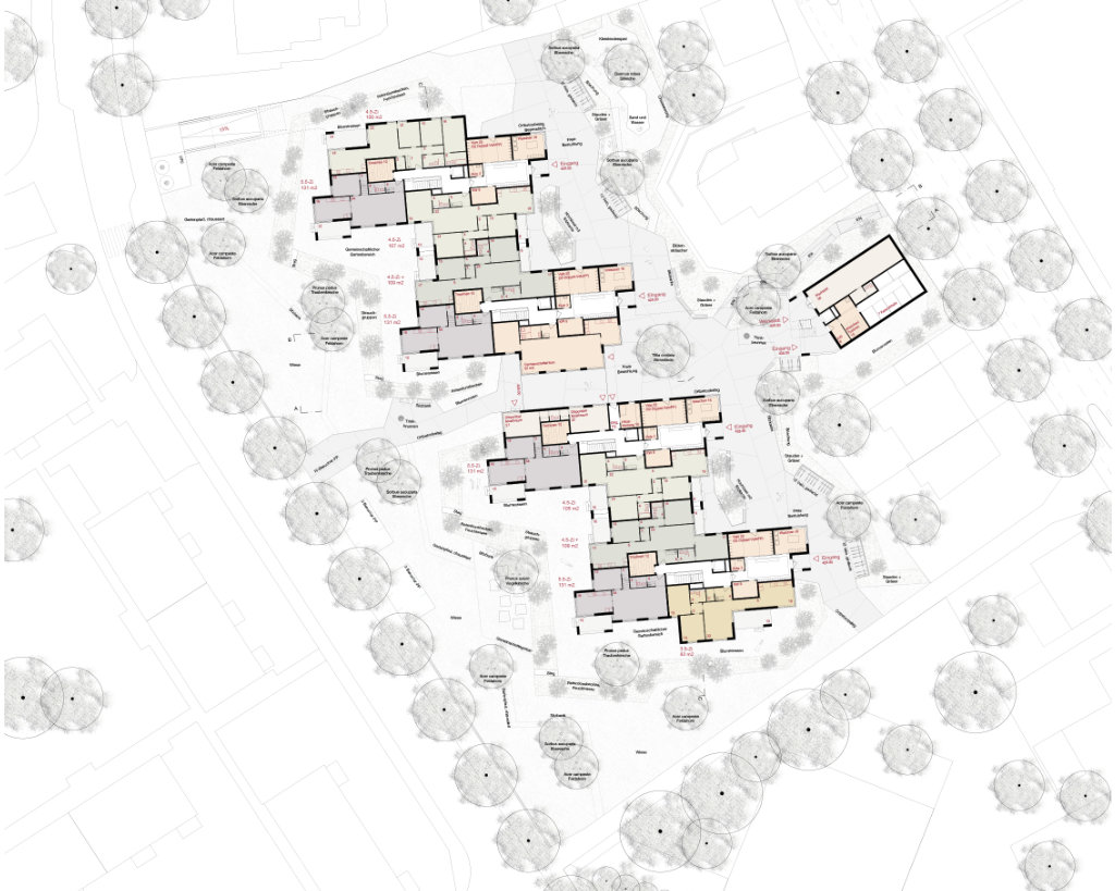 Das durchgrünte Wohnquartier Wollishofen ist charakterisiert von einer lockeren, offenen Bebauung mit frei stehenden Häuserzeilen. Der Perimeter liegt zwischen Tannenrauch- und Mutschellenstrasse, wo sich grössere Solitärbauten finden, welche von urbanen Aussenräumen und Gartenanlagen umgeben sind. Die bestehenden Wohnhäuser aus den 50er–Jahren zwischen der Tannenrauchstrasse und der Mutschellenstrasse entsprechen nicht mehr den heutigen Wohnbedürfnissen. Ziel der Wohn- und Siedlungsgenossenschaft Zürich (wsgz) sind ungefähr 100 qualitativ hochstehende, mehrheitlich Familienwohnungen in einem mittleren Preissegment mit geeigneten Begegnungszonen und Gemeinschaftsbereichen. Wir schlagen eine Konzentration der neuen Baumasse im östlichen Teil des Areals vor. Der grosse Neubau reiht sich selbstverständlich in die Gruppe der grösseren Einzelbauten entlang der Tannenrauchstrasse ein, die ebenfalls merklich von der Strasse zurückversetzt sind. Diese Positionierung schafft einen grosszügigen und nutzbaren, parkartigen Freiraum und erlaubt die Umsetzung eines Gebäudes mit einer starken Identität und Ausstrahlung ohne den Strassenraum nachhaltig zu verändern, sondern vielmehr in seinem Bestand aufzuwerten. Die Einbindung in den Kontext erfolgt über die Aufnahme der klaren Struktur der Grünräume und der Körnung der angrenzenden Bauten. Durch den neuen parkartigen Freiraum wird ein zusammenhängender, grosszügiger Grünraum entlang der Tannenrauchstrasse aufgespannt und stellt die Verbindung mit dem durchgrünten Quartier her. Mit der Staffelung des Gebäudevolumens werden eine Differenzierung des Baukörpers und eine masstäbliche Verbindung an die Körnung und die Traufhöhen der umgebenden Bebauungsstruktur erreicht. Das nach innen orientierte Begegnungsband ist der Kumulationspunkt und die zentrale Erschliessung aller Nutzungen der Genossenschaft. Die Konzentration der gemeinschaftlich genutzten Räumlichkeiten und der Hauszugänge begünstigt die Interaktion der Bewohner und fördert eine genossenschaftliche Gemeinschaft und Zugehörigkeit. Die Lage des Begegnungsbandes an der Strassen abgewandten Seite, schafft einen klar gefassten, gemeinschaftlichen Aussenraum, der die Identität der neuen Siedlung definiert und sie zur Einheit zusammenbindet. Der zentrale gedeckte Durchgang dient als multifunktionaler, gedeckter Aussenbereich. Die Hauptstruktur des grossen Neubaus besteht aus vier zueinander versetzten Vierspännern. Diese setzen sich jeweils aus zwei durchgesteckten Wohnungen und zwei Eckwohnungen zusammen. Eine Entwicklung in der Höhe und eine Ost-West Orientierung des Gebäudes generieren eine angemessene Vielfalt und eine Vielzahl an unterschiedlichen Wohnungen für alle Altersklassen und Lebenssituationen. Alle 92 Wohnungen besitzen mehrheitlich drei, mindestens aber zwei Ausrichtungen.