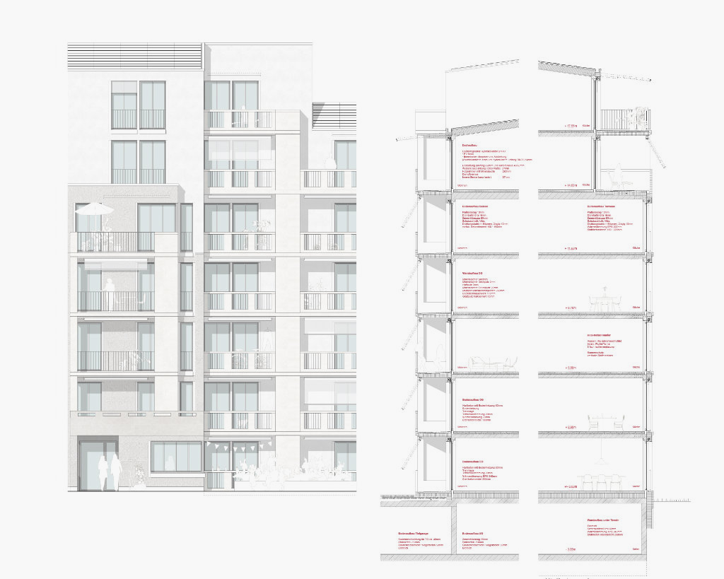 Die zwei Gebäude, das «Lange Haus» und das «Punkt Haus», schaffen ein Gefüge, das zusammen mit dem dritten wichtigen Element, dem «Gartenhof», zwischen dem städtischen Kontext und dem intimen Garten oszilliert. Strassenbegleitende Gebäude, innere zusammenhängende Gärten, Gebäude im Garten charakterisieren die Nachbarschaft und verankern die neue Genossenschaftssiedlung im Quartier. Trotz einer höheren Ausnutzung von 58 Wohnungen, fügt sich die neue Überbauung mit Dichte und ihren Proportionen ins Quartier ein.