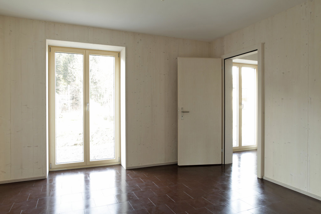 Das Gebäude ist als Holzbau mit einer 120mm massiven, inneren tragenden Schicht entworfen, die nur noch mit einer Leinölfarbe gestrichen die fertige innere Oberfläche bildet. In Kombination mit einem steinernen Sichtestrich, weiss gestrichenen Holzfenstern und einer naturbelassenen äusseren Holzschalung aus der örtlichen Sägerei, einer Dämmung aus Glasschaum oder Holzfasern, sowie einem Vordachhut aus massivem Stahl in der Art einer übergrossen Leuchte, prägen ausnahmslos natürliche Materialien nicht nur die Oberflächen, sondern auch die Tiefe der Konstruktion.