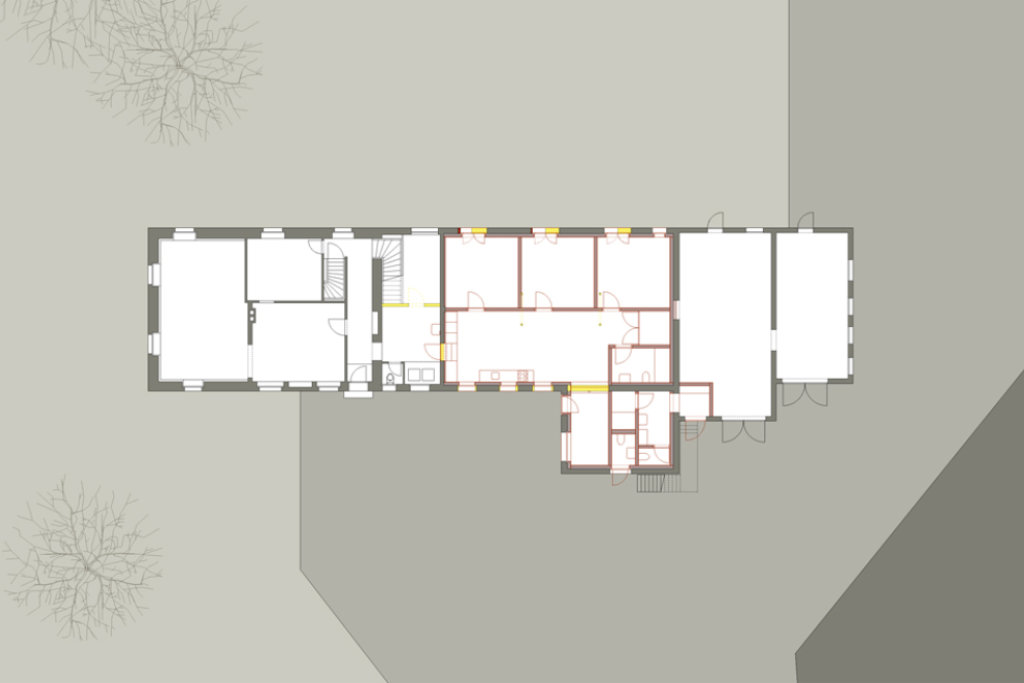 Innerhalb der Bestandsstruktur haben wir wenige, aber präzise Anpassungen vorgenommen, die eine freiere Benutzbarkeit, sowie vielfältigere räumliche Bezüge ermöglichen. Die sorgfältige, hochwertige Materialwahl im Ausbau, sowie Einbaumöbel, die im Charakter des Hauses entworfen sind, erzeugen mit wenig Maßnahmen viel Mehrwert. Aus energetischen Gründen wurde außerdem eine Fassadensanierung des in den 70er Jahren ergänzten Hausteils in Angriff genommenen. Gleichzeitig nahmen wir damit eine sanfte Korrektur im Gebäudeausdruck vor. Der fassadensanierte Hausteil gibt sich nun - bisher optisch dem alten Bestand angeglichen - neu durch seine gestrichene Holzverkleidung deutlich als hinzugefügter Anbau zu erkennen.
