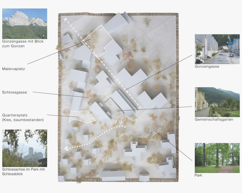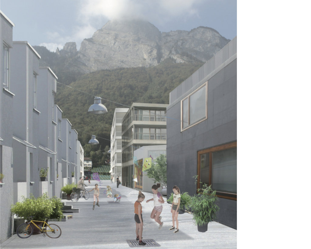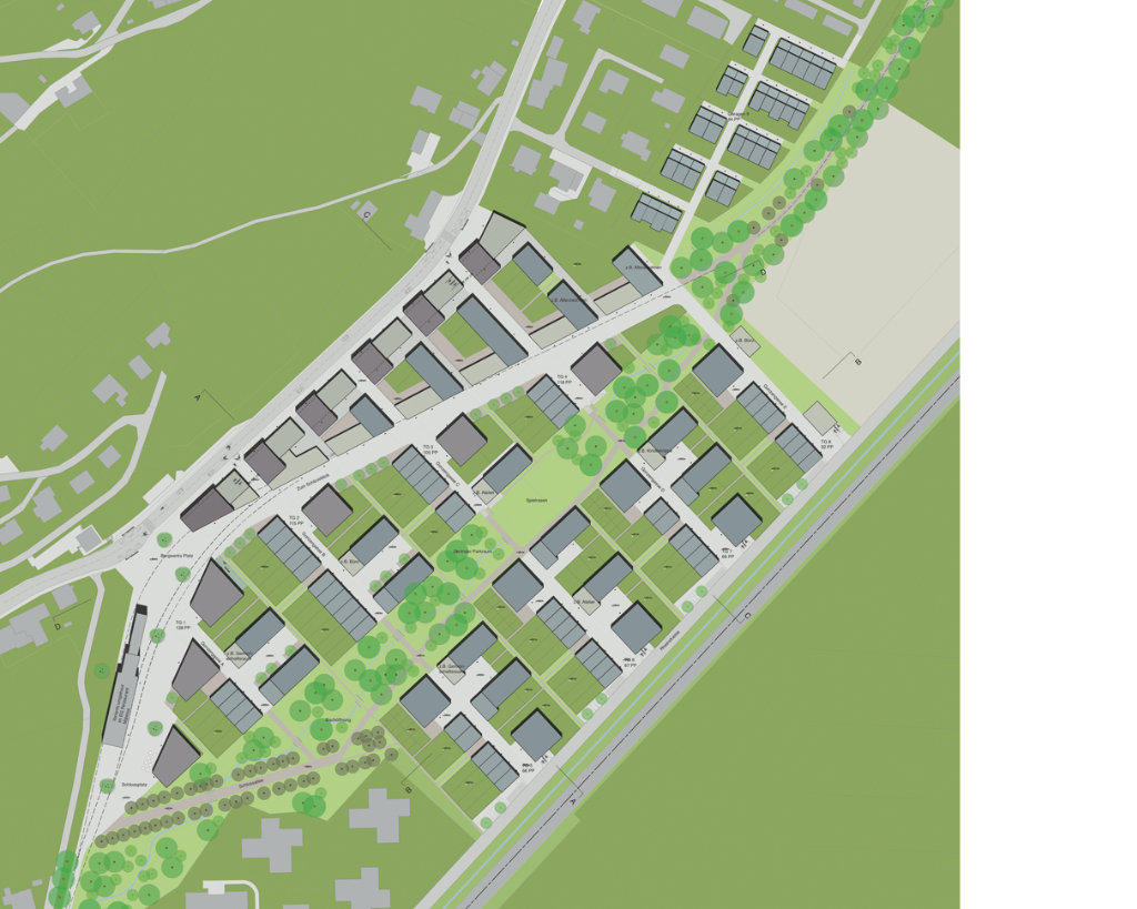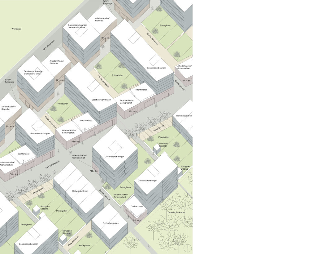 Auf Basis der städtebaulichen Entwicklungsstrategie für das gesamte Quartier Malerva Nord haben wir für die erste Etappe eine Überbauungsstudie als Richtprojekt für einen Überbauungsplan erarbeitet. Eine hohe Diversität in der Sozialstruktur soll durch einen breiten Mix an Gebäudetypen erreicht werden und gleichzeitig eine starke Identifizierung der Bewohner mit der Nachbarschaft durch hohe architektonische wie freiräumliche Qualitäten. Ein Grundgerüst in Form einer robusten identitätsstiftenden, städtebaulichen und freiräumlichen Grundstruktur schafft den Rahmen für eine langfristig dynamische und sozial gemischte Nachbarschaft. Die Freiraumstruktur der ersten Etappe bietet mit Gassen, Plätzen, Gärten und Park abwechslungsreiche und unterschiedliche Aussenräume, die sowohl in der ersten Etappe funktionieren und später auch Funktionen des Quartierzentrums für das gesamte Malerva Nord und seine nahe Umgebung übernehmen können. Die Etappe 1 bietet einen breiten Mix an Wohnungen mit verschiedenen Aussenräumen: Balkon/Loggia, privater/gemeinschaftlicher Garten oder Dachterrasse. In der Gestaltung der Erdgeschossräume wird auf eine flexible Nutzungsmöglichkeit Wohnen/Arbeiten geachtet und somit eine mögliche leichte Erhöhung des Gewerbeanteils bei der Erstellung weiterer Etappen eingeplant. Es gibt Möglichkeiten zur Kombination von Wohnen+Arbeiten einerseits in Atelier-Reihenhäusern, andererseits durch kleinere Gewerberäume entlang der Gassen - zur Miete oder als Eigentum.
