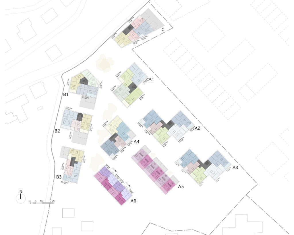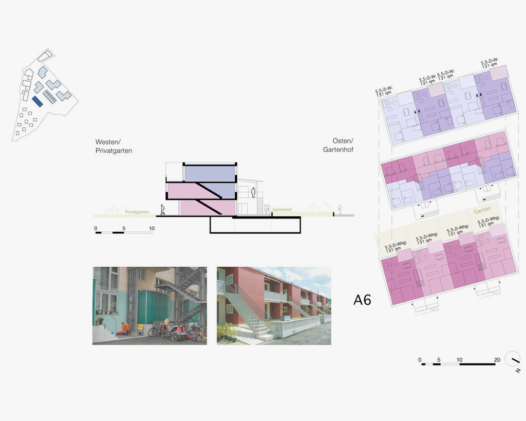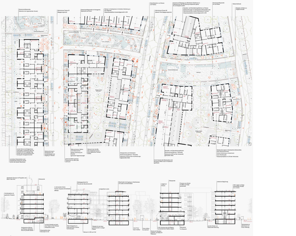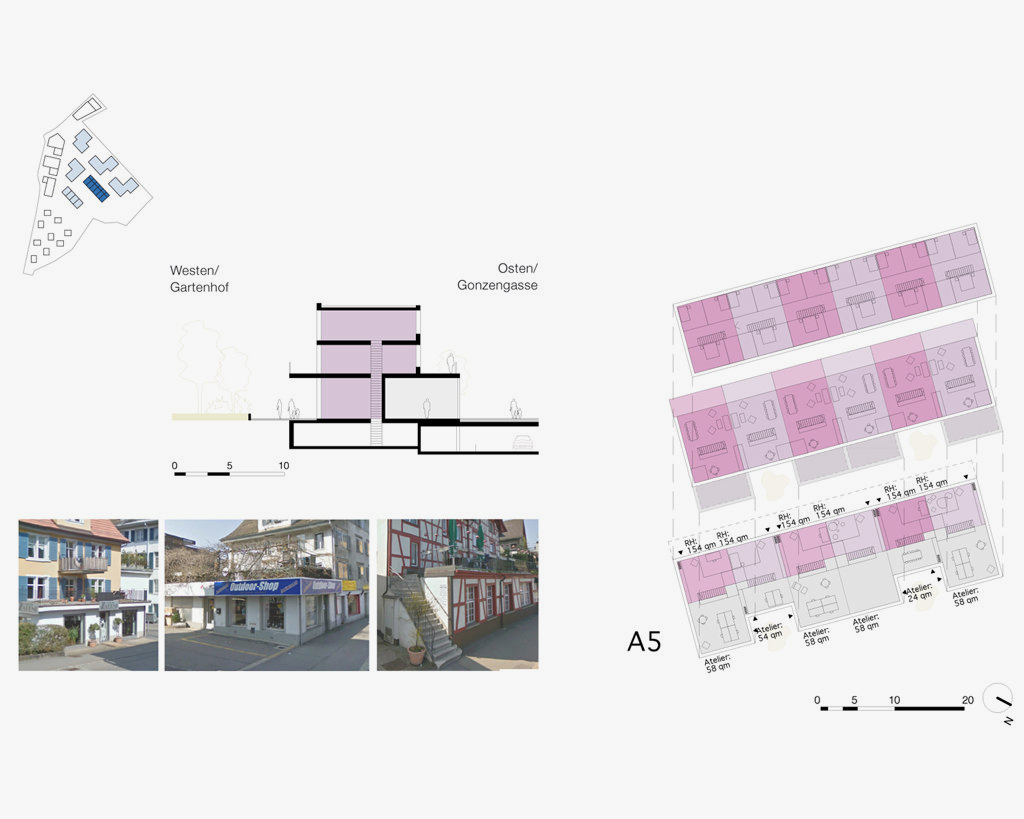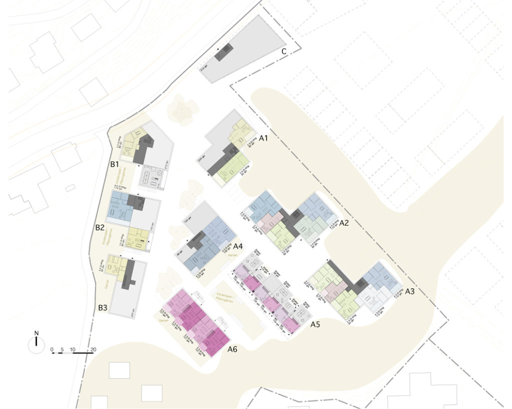 Auf Basis der städtebaulichen Entwicklungsstrategie für das gesamte Quartier Malerva Nord haben wir für die erste Etappe eine Überbauungsstudie als Richtprojekt für einen Überbauungsplan erarbeitet. Eine hohe Diversität in der Sozialstruktur soll durch einen breiten Mix an Gebäudetypen erreicht werden und gleichzeitig eine starke Identifizierung der Bewohner mit der Nachbarschaft durch hohe architektonische wie freiräumliche Qualitäten. Ein Grundgerüst in Form einer robusten identitätsstiftenden, städtebaulichen und freiräumlichen Grundstruktur schafft den Rahmen für eine langfristig dynamische und sozial gemischte Nachbarschaft. Die Freiraumstruktur der ersten Etappe bietet mit Gassen, Plätzen, Gärten und Park abwechslungsreiche und unterschiedliche Aussenräume, die sowohl in der ersten Etappe funktionieren und später auch Funktionen des Quartierzentrums für das gesamte Malerva Nord und seine nahe Umgebung übernehmen können. Die Etappe 1 bietet einen breiten Mix an Wohnungen mit verschiedenen Aussenräumen: Balkon/Loggia, privater/gemeinschaftlicher Garten oder Dachterrasse. In der Gestaltung der Erdgeschossräume wird auf eine flexible Nutzungsmöglichkeit Wohnen/Arbeiten geachtet und somit eine mögliche leichte Erhöhung des Gewerbeanteils bei der Erstellung weiterer Etappen eingeplant. Es gibt Möglichkeiten zur Kombination von Wohnen+Arbeiten einerseits in Atelier-Reihenhäusern, andererseits durch kleinere Gewerberäume entlang der Gassen - zur Miete oder als Eigentum.