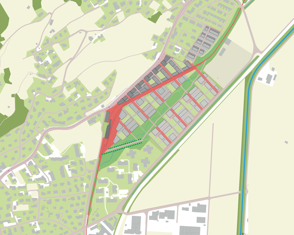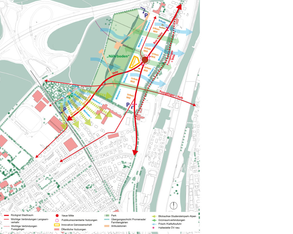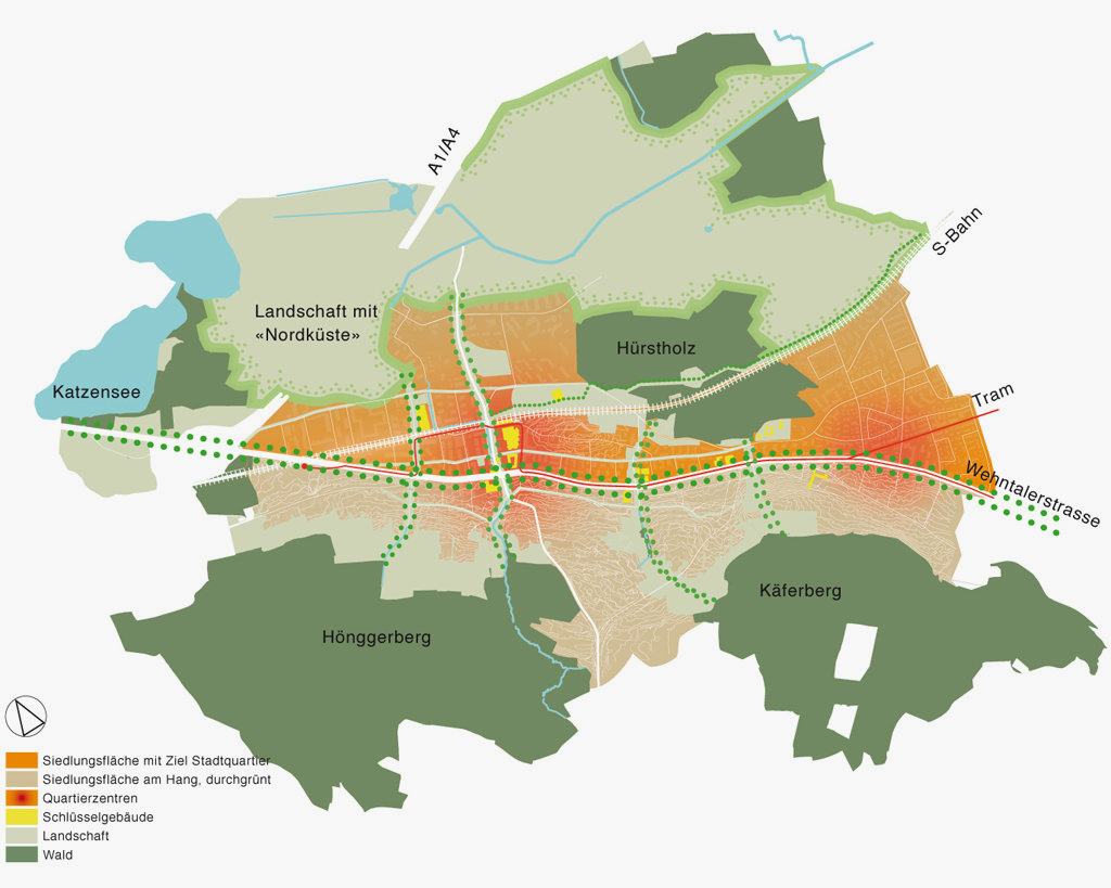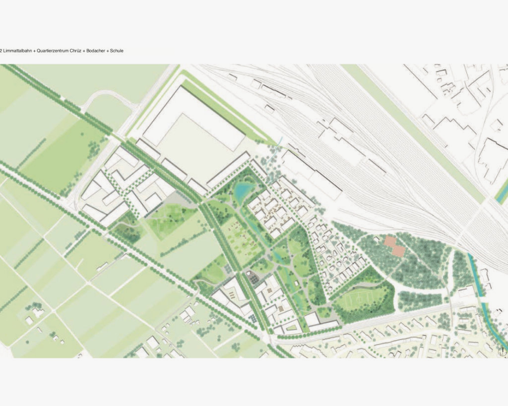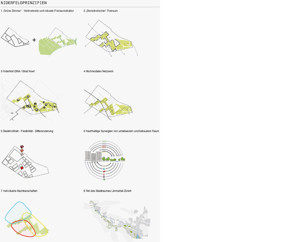 Das Niderfeld wird eine innovative und städtische Struktur, die weder Stadt noch ‚Suburb’ ist. Das Niderfeld wird von den im Limmattal typischen, linear zum Tal verlaufenden Erschliessungsachsen geprägt und es ist regional sehr gut erschlossen. Trotz dieser starken linearen Gliederung des Limmattals ist es ökologisch wichtig, dass die landschaftliche Querverbindung im Tal gestärkt wird. Die neue räumlich-städtebauliche Struktur soll sich auf dem Niderfeld in Dichte, Massstäblichkeit, Programmierung und Gebäudetypen unterscheiden. Der neue Boulevard, die verlängerte Badenerstrasse, wird u.a. die Limmattalbahn führen und wird das zentrale langfristige Entwicklungsrückgrat bis nach Spreitenbach, bzw. Baden. Um die neuen LTB-Haltestellen Chrüz und Bodenacher wird räumlich eine zusätzliche Verdichtung vorgesehen und programmatisch werden die Grundlagen geschaffen für eine höhere Diversität. An der LTB-Haltestelle Chrüz ist das Quartierzentrum geplant. Unmittelbar neben dem Quartierzentrum - im Anschluss an den Parkraum „Sportzimmer“ - wird der Schulstandort vorgeschlagen.