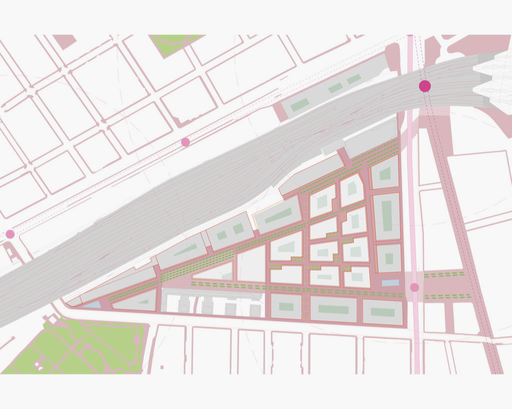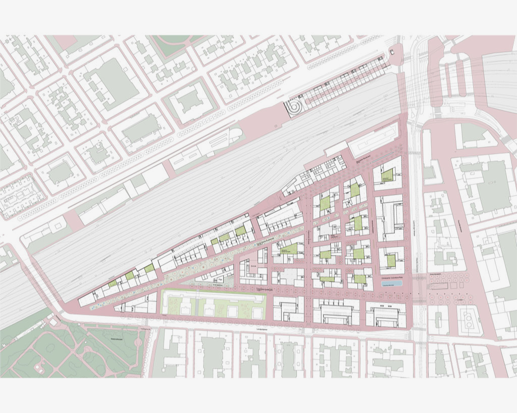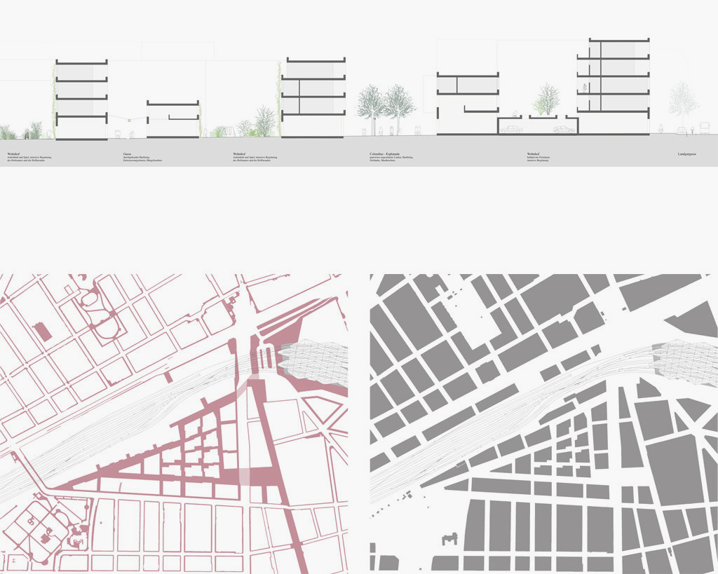 Die Struktur der öffentlichen Räume und Baufelder basiert auf Fortsetzung der umliegenden Quartierstrassen, Grünräume und Plätze. Gleichzeitig ist die Absicht eine „Pufferzone“ aus verbindenden urbanen Strukturen und Programmen entlang des Gleisfeldes, der Laxenburger Strasse und der Landgutgasse zu bilden. Somit lässt sich ein urbaner (nach aussen harter, nach innen weicher) Ring und ein innenliegender poröser Kern, durch den Massstab „Mensch“ charakterisiert, als fussgängerorientierte Quartierstruktur erkennen. Der poröse Kern ist von Qualitäten eines gemischten urbanen „Altstadtquartieres“ charakterisiert. Der öffentliche Raum spannt ein Fussgängernetz auf. Die Massstäblichkeit dieser räumlichen Sequenz wird komplementär genährt von den Nutzungen in den Sockelbereichen, der Abwechslung der Architektur und örtlichen Durchwegungen. Dieser neue und qualitativ hoch stehende Freiraum kann gleichzeitig für die umgebenden Quartiere von Favoriten funktionieren und diese aufwerten. Durch geringe massstäbliche Anpassung (Verdichtung) des öffentlichen Raumnetzes, fußläufige Distanzen, gute Orientierungsfähigkeit, kurze Wege, sowie der Idee der primären Nutzung der Straße als öffentlichen Aufenthaltsraum, wird eine urbane Struktur mit Kfz-verkehrsminimierender Lebensweise erreicht. Die robuste Grundstruktur mit der gleichzeitig heterogenen Entwickelbarkeit bildet den Nährboden eines auch in Zukunft dynamischen und sozialen Lebensraums.
