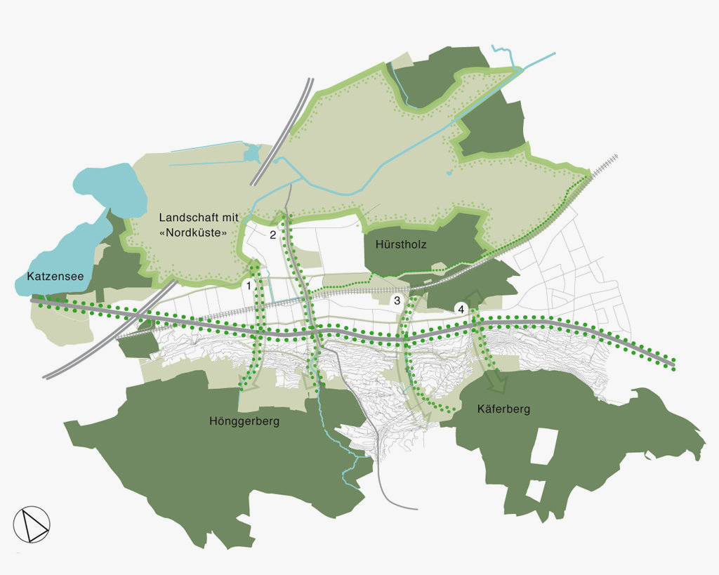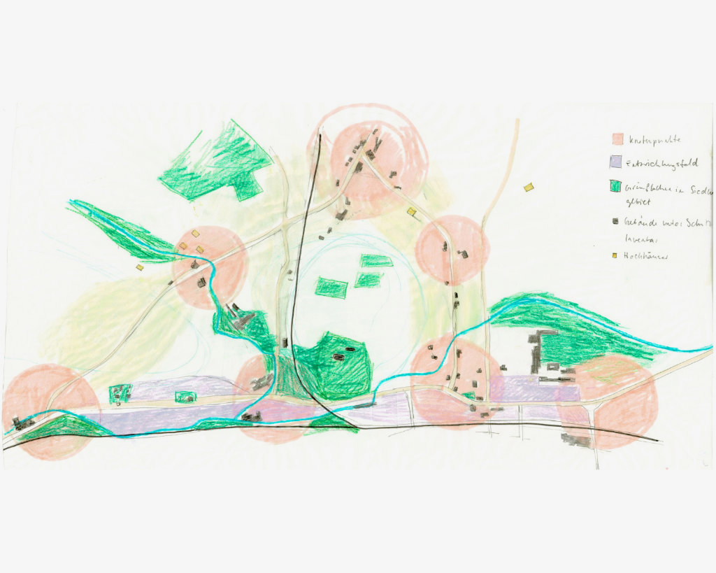 Das Niderfeld ist eine der letzten grossen und zusammenhängenden Entwicklunsgreserven im Kanton Zürich. Die Entwicklung des Niderfelds sehen wir als Teil einer grösseren Stadtentwicklung auf Basis individueller Nachbarschaften im Stadtraum Limmattal-Zürich. Das Niderfeld wird Teil eines neuen Stadtbausteins zwischen Dietikon und Spreitenbach. Dieser neue Stadtbaustein kann die Grösse und zusammen mit den bestehenden Nutzungen im Umfeld die Programmvielfalt eines eigenen Stadtquartiers bekommen. Er soll Gemeinde- und Kantongrenzen übergreifend funktionieren. Das in die Umgebung vernetzte Parksystem der „Grünen Zimmer“ soll dabei die robuste freiräumliche Grundlage für eine Integration im Stadtraum Limmattal-Zürich bilden.