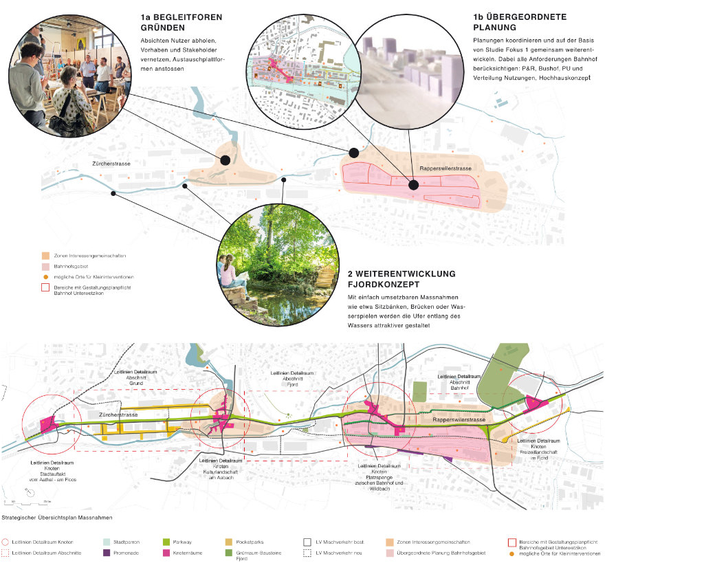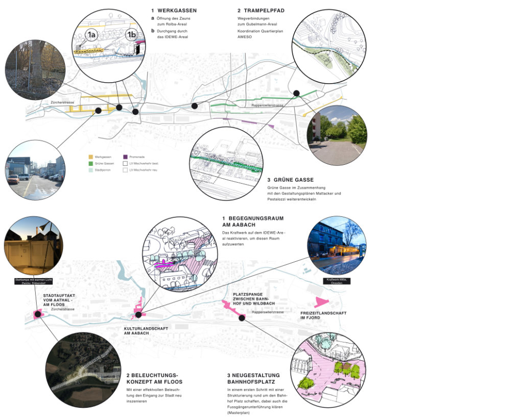 Fünf thematischen Bereiche gliedern die einzelnen Entwicklungsmassnahmen. Der Übersichtsplan «Massnahmen» zeigt den Zusammenhang der einzelnen Massnahmen, welche kurz–, mittel– und langfristig umgesetzt werden können. Sie sind zeitlich flexibel und nicht direkt von einander abhängig, sollen aber zusammen gedacht und integriert geplant werden, damit sie das volle Potenzial an Synergien entwickeln können.