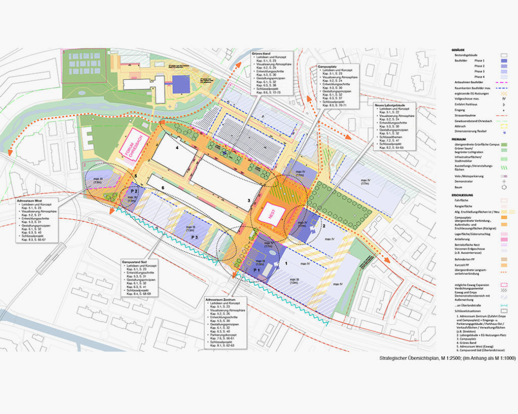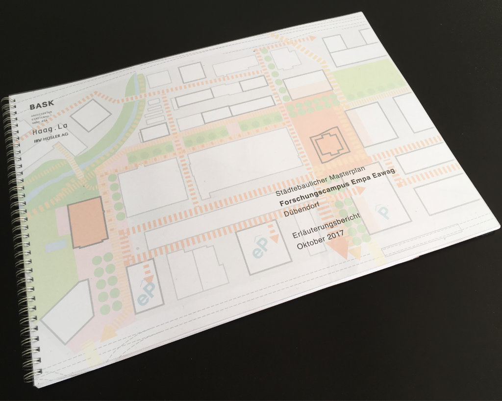 Der Masterplan wurde in einem stakholderbasierten Prozess unter Einbezug und Mitwirkung von Entscheidungsträgern und Nutzern der Empa und Eawag erarbeitet. Dabei wurden insbesondere Schlüsselthemen wie die zukünftige Nutzung der Baulandreserven, die Verdichtung bereits bebauter Bereiche, die verkehrliche Erschliessung, ökologische Themen sowie gestalterische Prinzipien aus der komplexen, multidisziplinären Logik des bestehenden Areals herausgearbeitet. Die Vision des Forschungscampus basiert auf dem Entwicklungsleitbild und lässt durch ihre robuste städtebauliche Grundstruktur grosse Freiheiten und Veränderbarkeit zu. Dies wurde in verschiedenen städtebaulichen Szenarien untersucht und mittels einzelner, tiefgreifender Schlüsselprojekte auf ihre Plausibilität erprobt. Als Ergebnis wurde ein strategischer Masterplan für den Forschungscampus mit Entwicklungsetappen von zwei bis 20+ Jahren erarbeitet, welcher auf aktuelle, aber auch auf zukünftig auftretende planerische Herausforderungen Antworten geben kann.