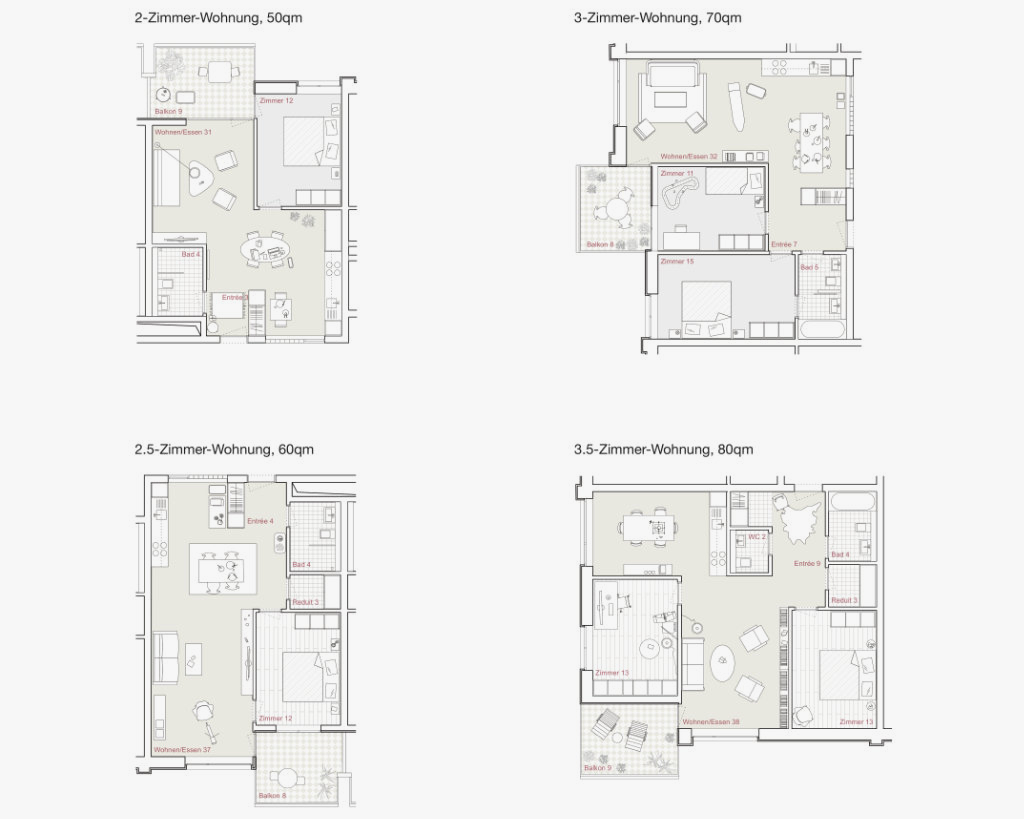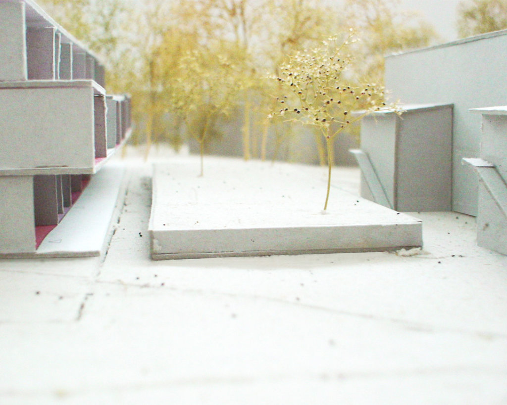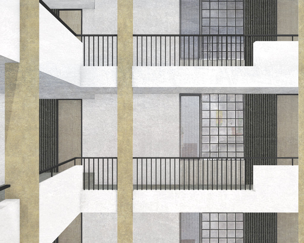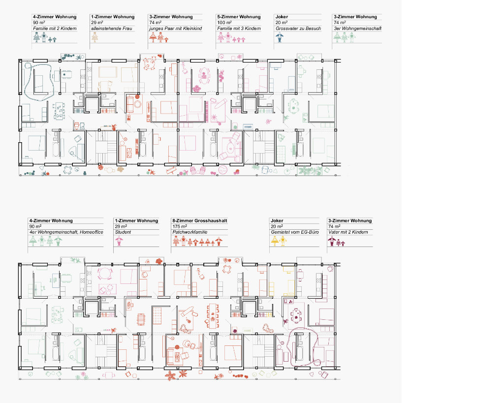 Die Ausrichtung der drei Ersatzneubauten im Quartierzentrum folgt der Logik des gesamten Quartiers. Die drei Ersatzneubauten sind alle als allseitig ausgerichtete Punkthäuser konzipiert, auch im Erdgeschoss. Durch die vierseitige Orientierung wird ein Bezug des Quartierzentrums zur Umgebung gestärkt. Durch die grosse Gebäudetiefe entstehen gleichzeitig zum Platz und zum Grünraum belebte Frontfassaden. Dies ermöglicht im Erdgeschoss eine sinnvolle Mischung von öffentlichen bzw. publikumsorientierten Nutzungen und Wohnungen zu planen. In den oberen Geschossen belebt die Ausrichtung von Wohnräumen zum Platz diesen zusätzlich. Über eine einzige vertikale Erschliessung gelangt man in die oberen Stockwerke. Die „Wohnwelt“ eröffnet sich mit einem grosszügigen, natürlich belichteten Treppenhaus ab dem 1. Obergeschoss.