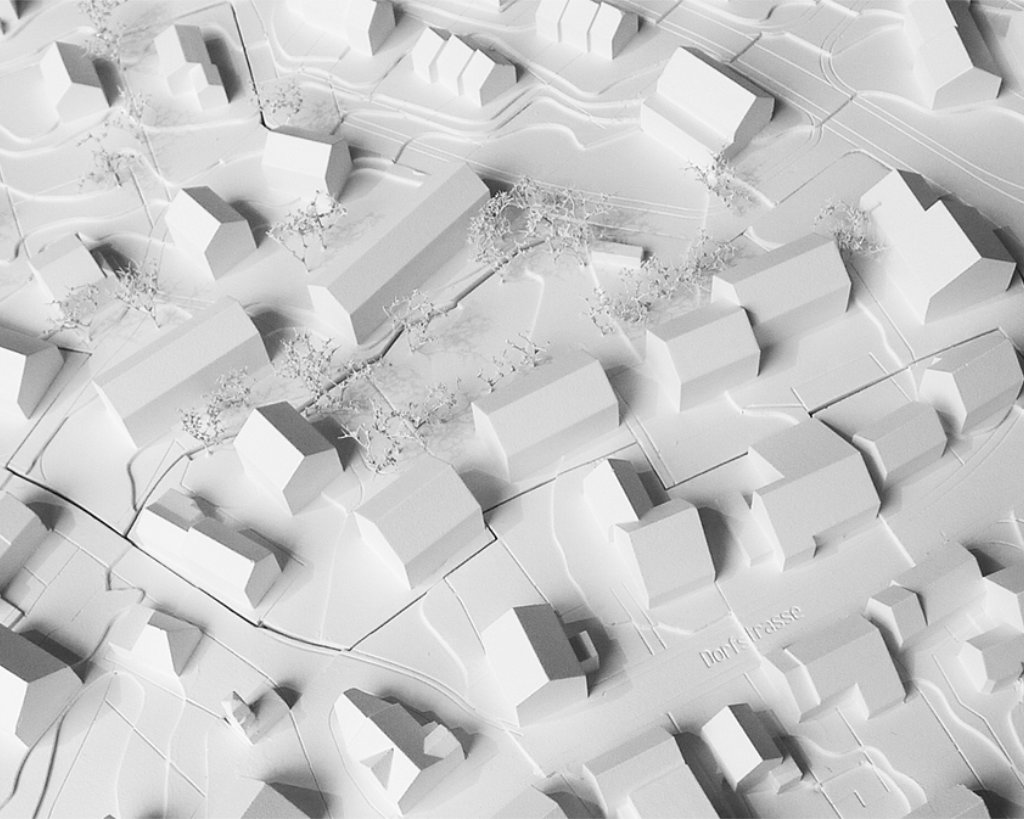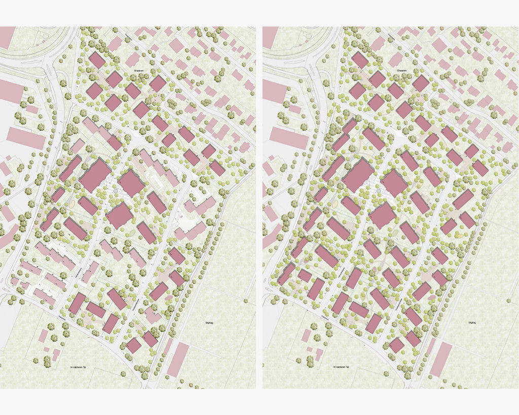 Unsere städtebauliche Entwicklungsstrategie für das Hohrainli wird als Weiterentwicklung der existierenden Qualitäten der Bestandssituation umgesetzt. Gleichzeitig müssen aber auch neue Bausteine entwickelt werden, die das Potential haben, das Quartier sofort oder in einer noch weitestgehend offenen Zukunft aufzuwerten. Die Aussenräume und deren Vernetzung sind das robuste Grundgerüst einer zukünftigen qualitätsvollen und schrittweisen städtebaulichen Transformation. Ein Regelwerk definiert die grundlegenden freiräumlichen und baulichen Vorgaben. Die Verdichtungsstrategie baut pragmatisch auf dem Bestand auf. Ob dabei Neubauten, An- oder Aufstockungen zu Zuge kommen, wird den einzelnen Besitzern grundsätzlich offen gelassen. Die „Vision 2070“ ist der Klarheit halber durchgehend mit Ersatzneubauten dargestellt. Das Quartierzentrum als Ort der grössten Dichte im Hohrainli liegt zentral. Insgesamt soll das selbstverständliche Gesamtbild einer von Grünraum umflossenen und verdichteten Stadtlandschaft wieder qualitativ aufgewertet werden.