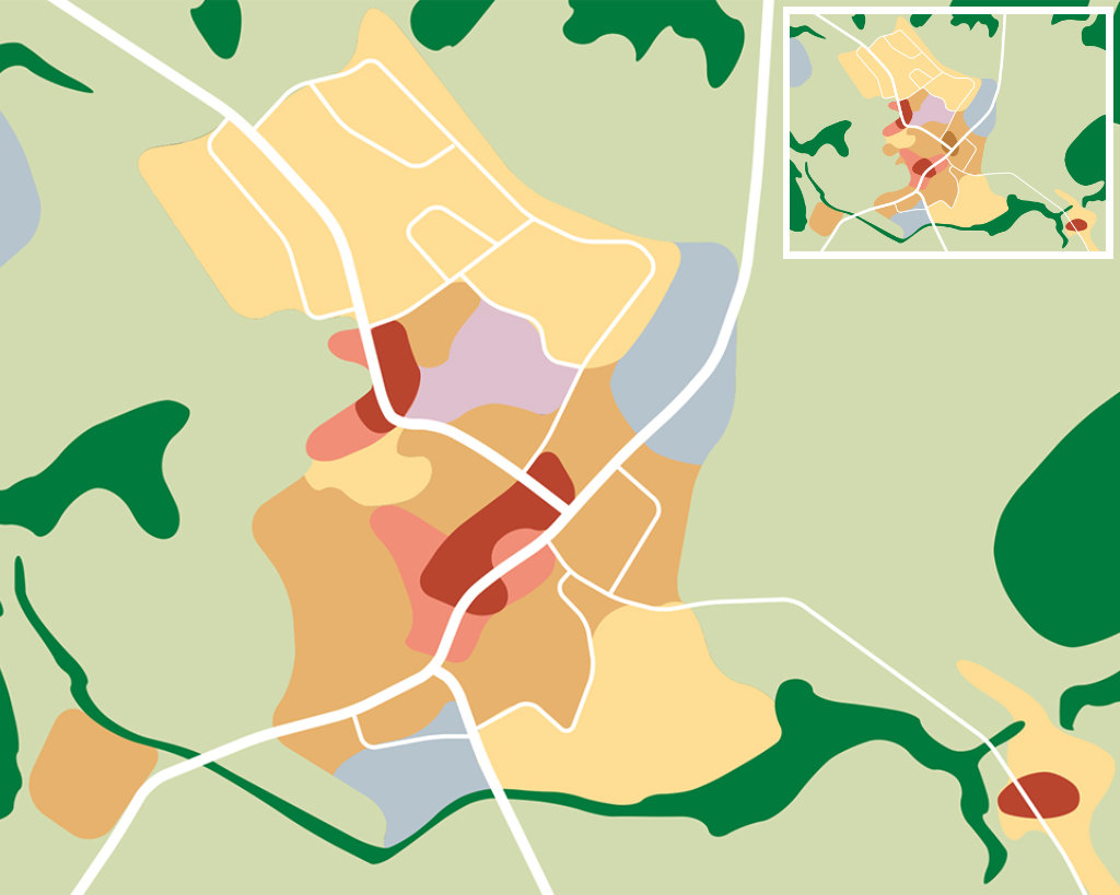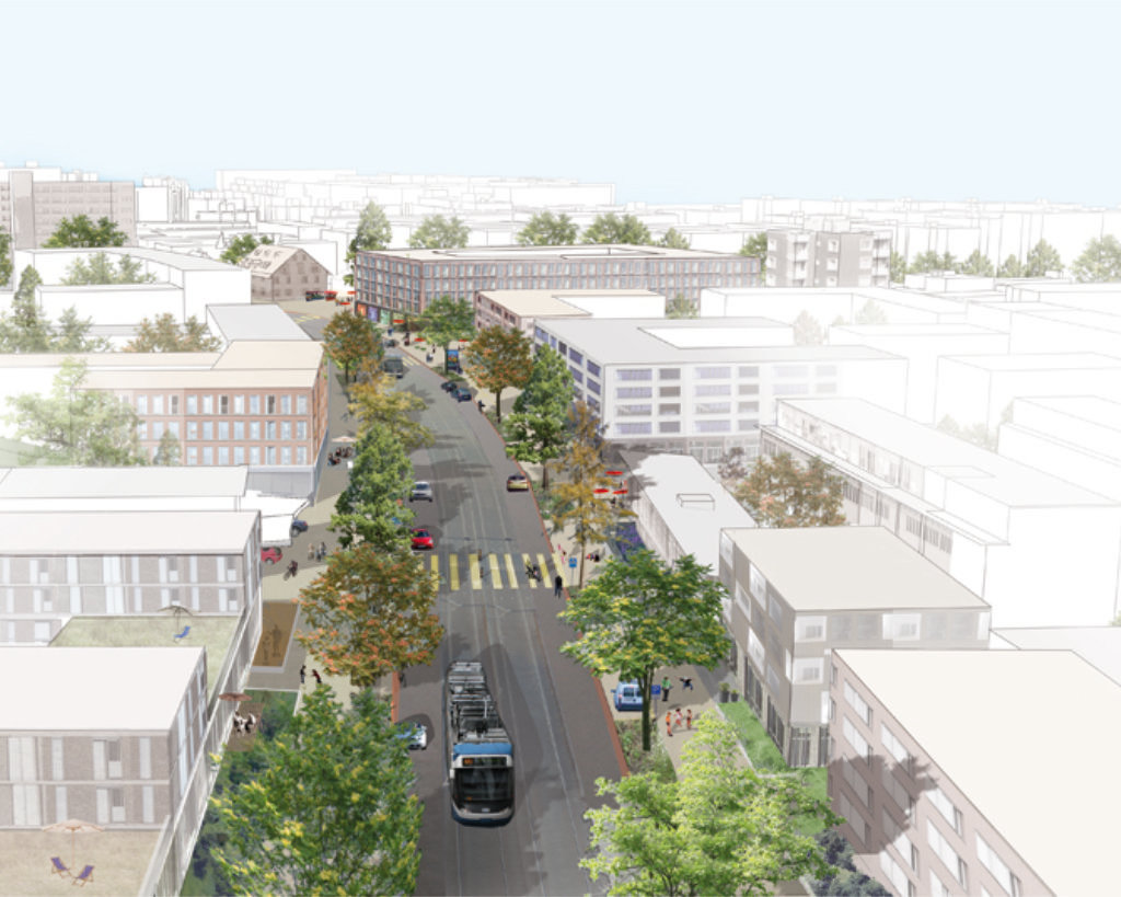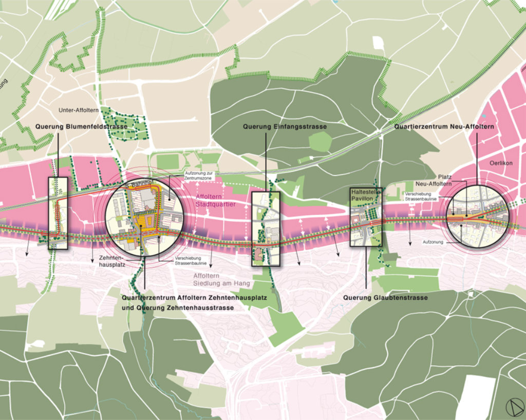 Die zukünftige Entwicklung der Wehntalerstrasse hängt stark zusammen mit der Entwicklung des Quartiers Affoltern als Ganzes. Dies ist ein zentrales Ergebnis der Studie. Drei übergeordnete städtebauliche Strategien bilden dabei das planerische Grundgerüst für die zukünftige Entwicklung Affolterns: