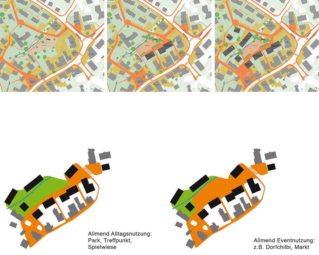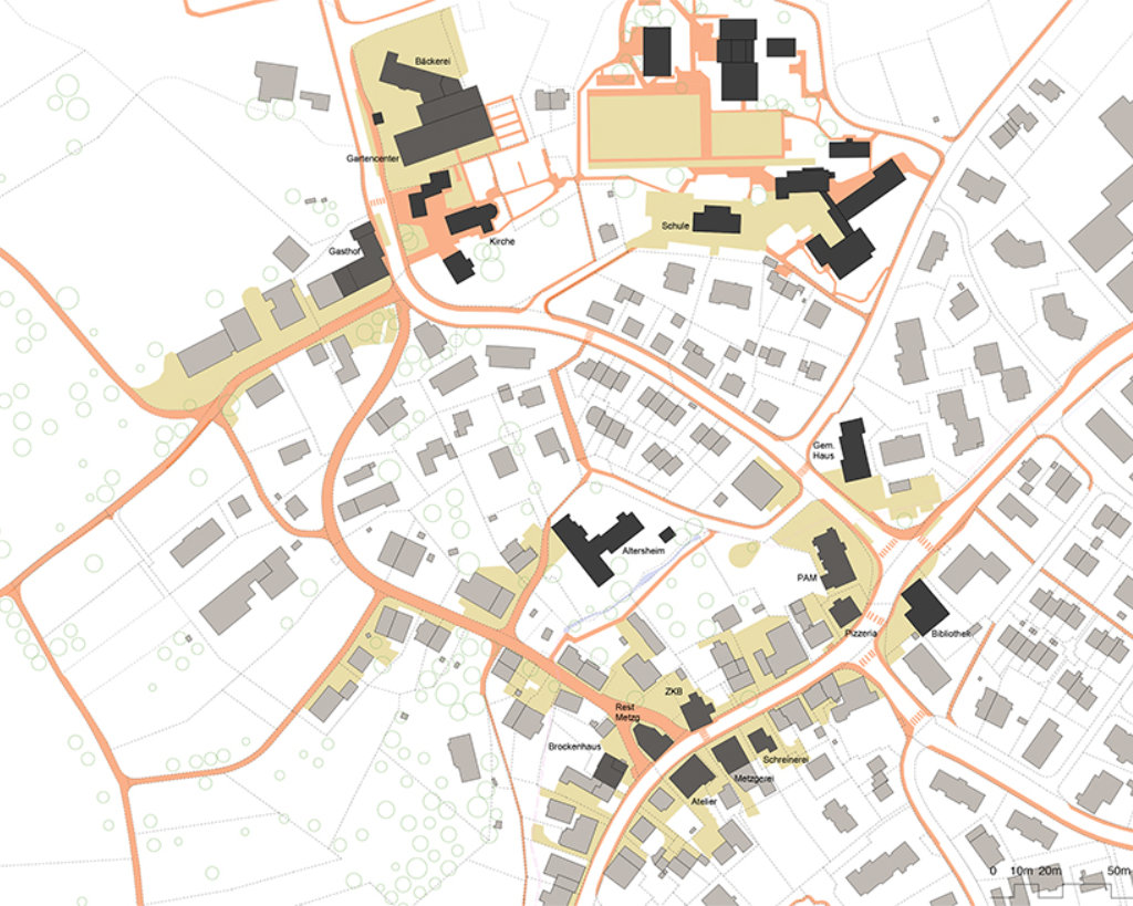 Die Gemeinde Russikon erwartete durch die Testplanung Lösungsvorschläge zu den Themen und Problemstellungen Ortseingang Fehraltdorferstrasse, Überbauung potentielle Baulandreserve Zelgli, Alters-/ Pflegezentrum Rosengasse, Zukunft Dorfzentrum, Kernzone Berggasse und zum Verdichtungspotential der Kernzone. Unsere Lösungsvorschläge verfolgen die städtebauliche Strategie, aus den 5 Zentrumsfragmenten zwei qualitativ gut funktionierende Dorfzentren auszubilden: eines im Unterdorf und eines im Oberdorf. Letzteres um das Gartencenter funktioniert bereits gut. - Neues Dorfzentrum: Die Allmend als multifunktionale öffentliche Nutzfläche soll ein Hauptelement des neuen Dorfzentrums werden und als neues Bindeglied zwischen den bisherigen Zentrumsfragmenten liegen. Eine bauliche Verdichtung soll die räumliche Klärung der rückwärtigen Zone der Dorfstrassenbebauung und die räumliche Fassung der Allmend erreichen. Die physische und programmatische Vernetzung soll über das Integrieren von bestehenden Nutzungen und Wegenetze der beiden bisherigen Zentrumsfragmente erreicht werden. Die Raumfolge Berggasse/Metzg - Allmend - Pam - Gemeindehaus soll als kontinuierliche Kumulation der öffentlichen Angebote (Mehrgenerationenwohnen, Alterswohnen, Bibliothek, Kleinverteiler) das räumliche Rückgrat des Dorfzentrums bilden.