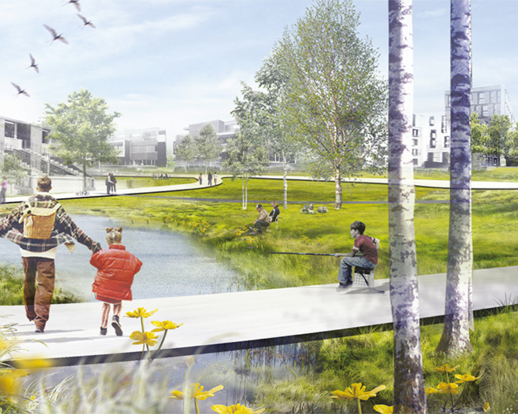 Die bestehende, kleinstrukturierte Kulturlandschaft sowie die Bachstruktur auf dem Niderfeld sollen als Inspiration für eine neue Parktypologie mit „Grünen Zimmern“ dienen. Dabei sollen die charakteristischen Elemente verstärkt werden. Die vorhandenen topografischen Unterschiede werden ins Parkkonzept aufgenommen: die nassen, tiefer gelegenen Bereiche werden ökologisch genutzt, die trockenen, höher gelegenen Gebiete dienen der Freizeitbeschäftigung. Der Grünraum erhält seine Logik aus der DNA des Niderfelds (den schon vorhandenen Qualitäten) und den erforderlichen, neuen Funktionen.