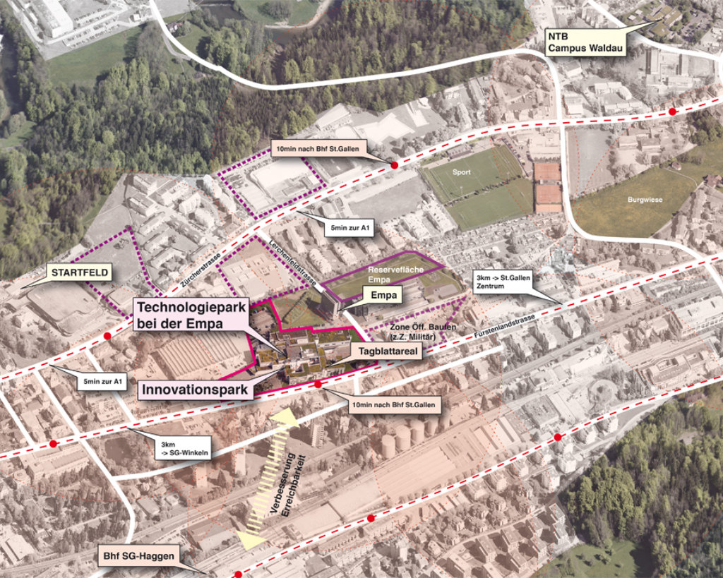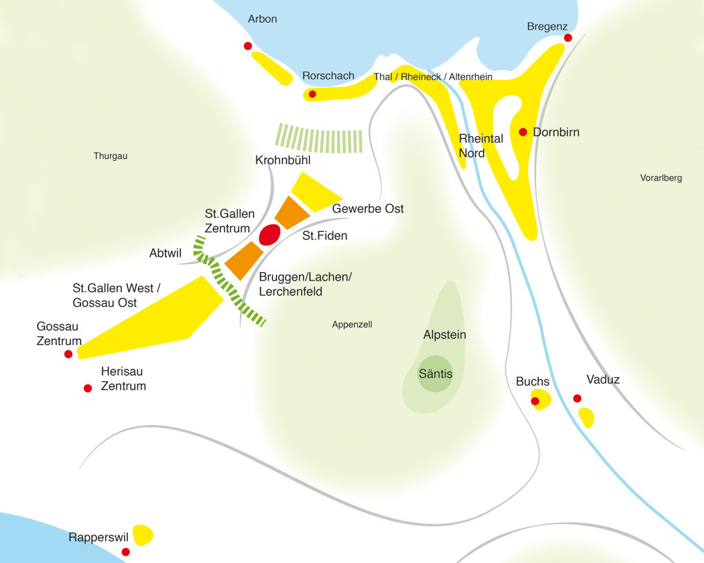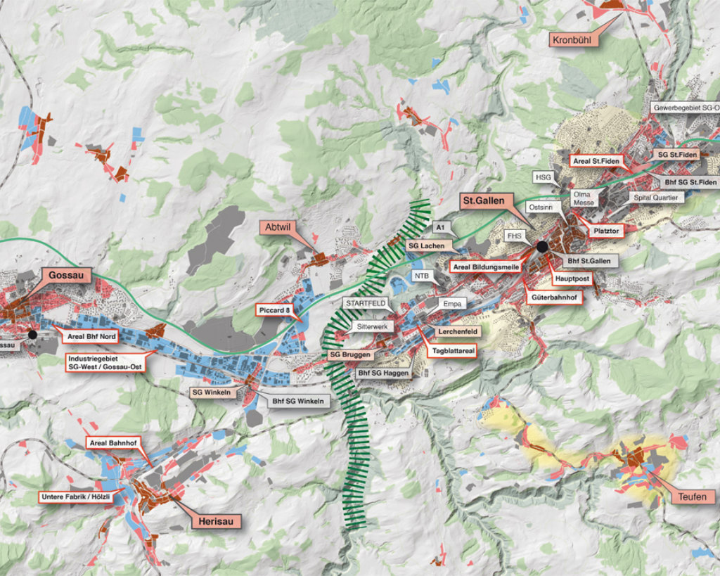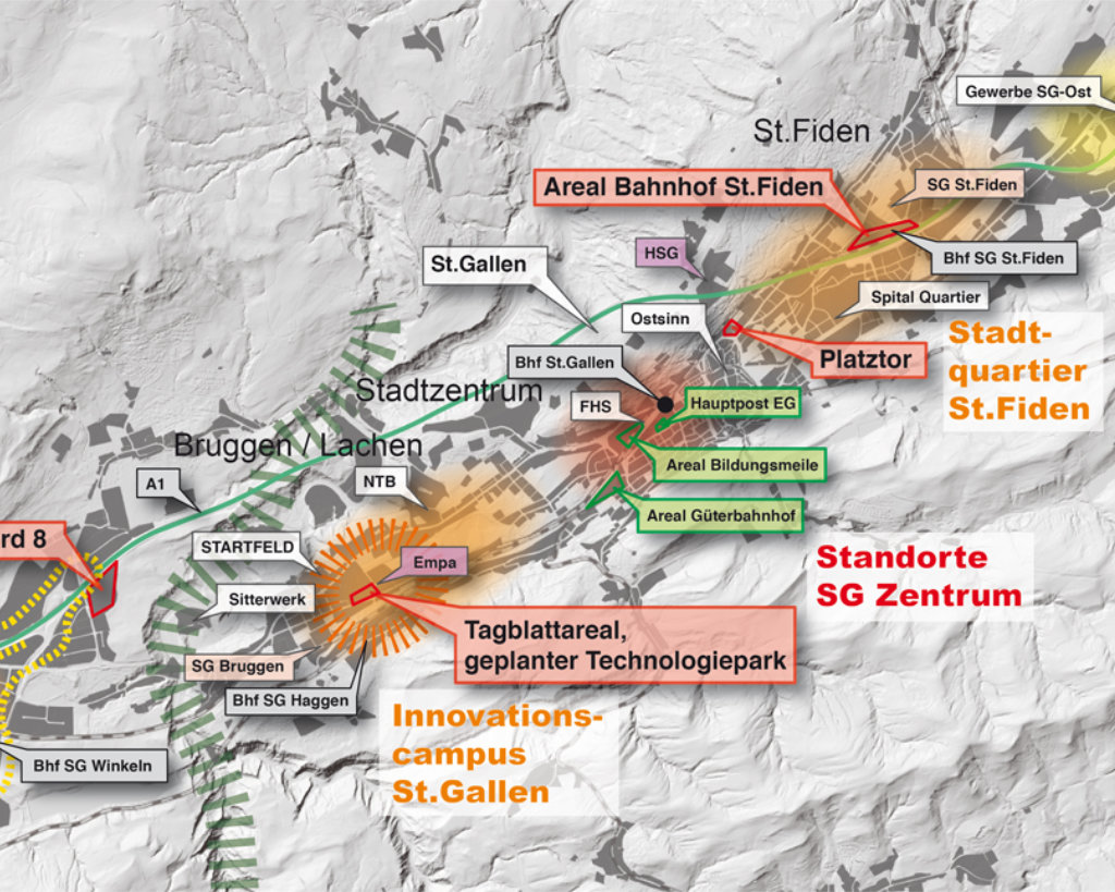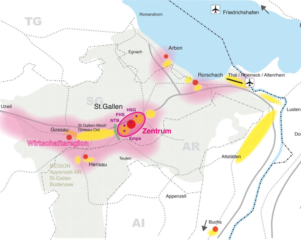 Das gezielte Aktivieren der spezifischen räumlichen Standortqualitäten ist die Basis für eine langfristig erfolgreiche Weiterentwicklung der Lebens- und Wirtschaftsregion St.Gallen. Die Machbarkeitsstudie zeigt auf verschiedenen Massstäben Entwicklungsstrategien, wie mit spezifischen räumlich-programmatischen Massnahmen ein optimaler Nährboden zur Stärkung der Innovationskraft geschaffen werden kann. Dabei steht die physische Vernetzung von existierenden und neuen Netzwerken sowie Akteuren im Vordergrund. Gute Standorte für das Entwickeln solcher Nährböden sind jeweils diejenigen, an denen sich auch die Umgebung mitentwickeln kann, d.h. langfristig Synergien auftreten können. Regionale und lokale Netzwerke überlagern sich dort mit nationalen und internationalen.
